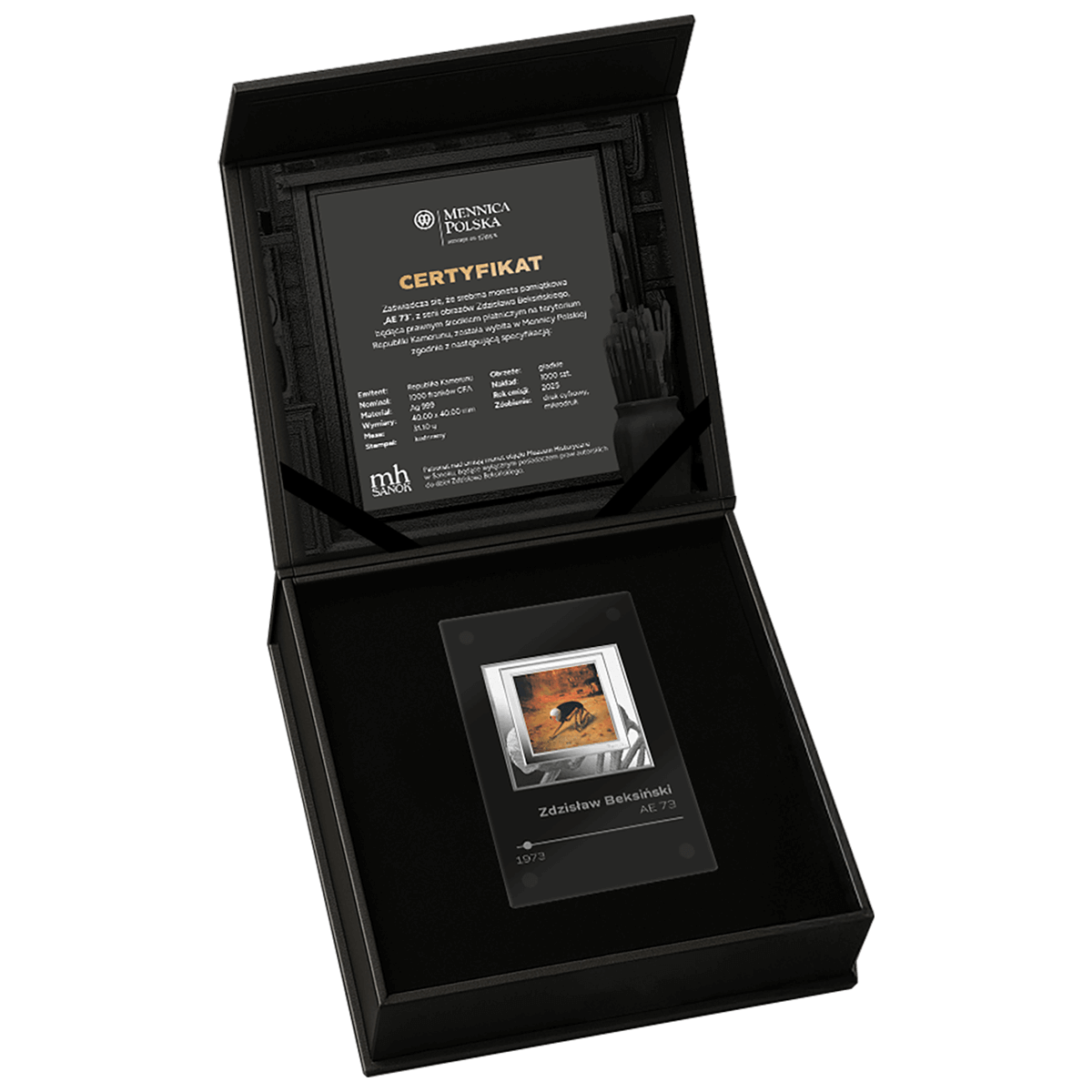Tej niezwykłej serii towarzyszy zupełnie nowy, unikatowy ekspozytor, zaprojektowany tak, aby idealnie korespondował z mroczną i fascynującą estetyką prac Mistrza. Stanowi on nie tylko bezpieczne schronienie dla monet, ale przede wszystkim elegancką ramę, pozwalającą na ich godną prezentację. Wyjątkowy charakter czyni ten zestaw pożądanym rarytasem zarówno dla miłośników sztuki Beksińskiego, jak i wytrawnych inwestorów poszukujących rzadkich walorów.