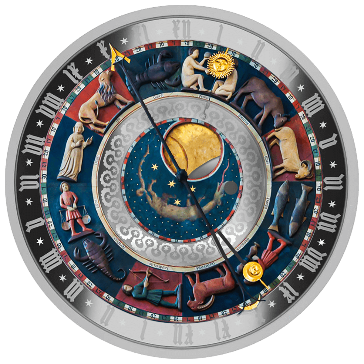 zodiaku i kalendarz świąt. W południe prezentuje procesję Apostołów. Srebrna moneta