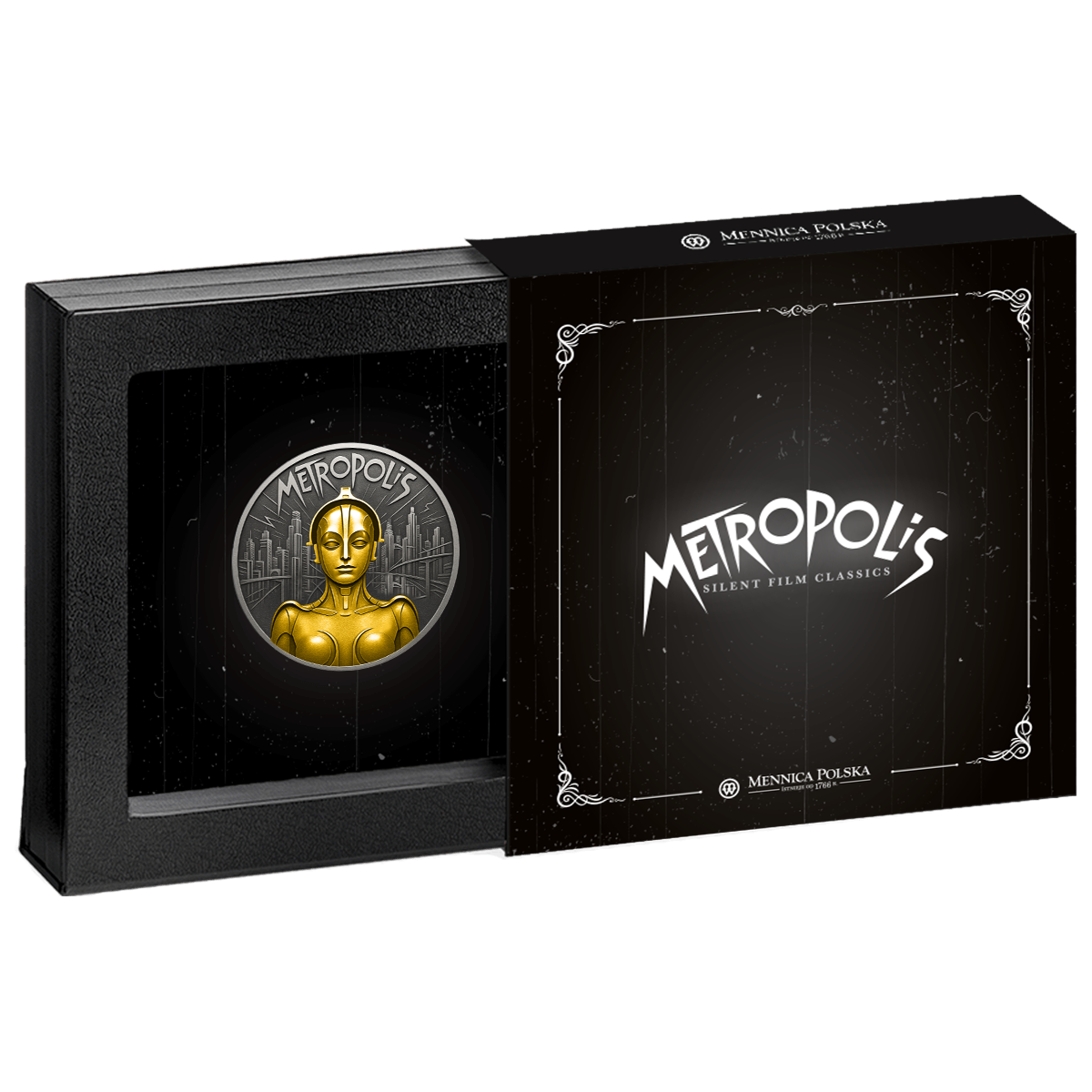 Metropolis to jedno z najważniejszych dzieł w historii kina. Wizjonerska opowieść o mieście przyszłości, w którym technologia zaczyna dominować nad człowiekiem, od lat inspiruje twórców i widzów. Moneta odtwarza tę wyjątkową atmosferę, łącząc rytm geometrycznej architektury, chłodny blask metalu i wizerunek Marii – postaci, w której spotykają się elementy ludzkie i mechaniczne. Selektywne złocenie subtelnie akcentuje jej podwójną naturę. Całość tworzy projekt, który łączy precyzję rzeźbiarską z refleksją nad światem szukającym równowagi między technologią a emocjami.