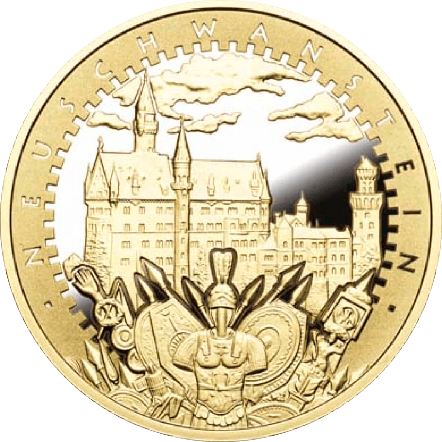 Niezwykły, baśniowy NEUSCHWANSTEIN (Niemcy) – zamek bawarskiego króla Ludwika II Wittelsbacha, znanego również jako Ludwik Szalony lub Bajkowy Król. Na awersie widnieje, pochodząca ze szczytu fasady zamku Neuschwanstein, postać rycerza. Rycerz umieszczony jest w stylizowanej tarczy heraldycznej z labrami. Powyżej stylizowany hełm heraldyczny z koroną heraldyczną.