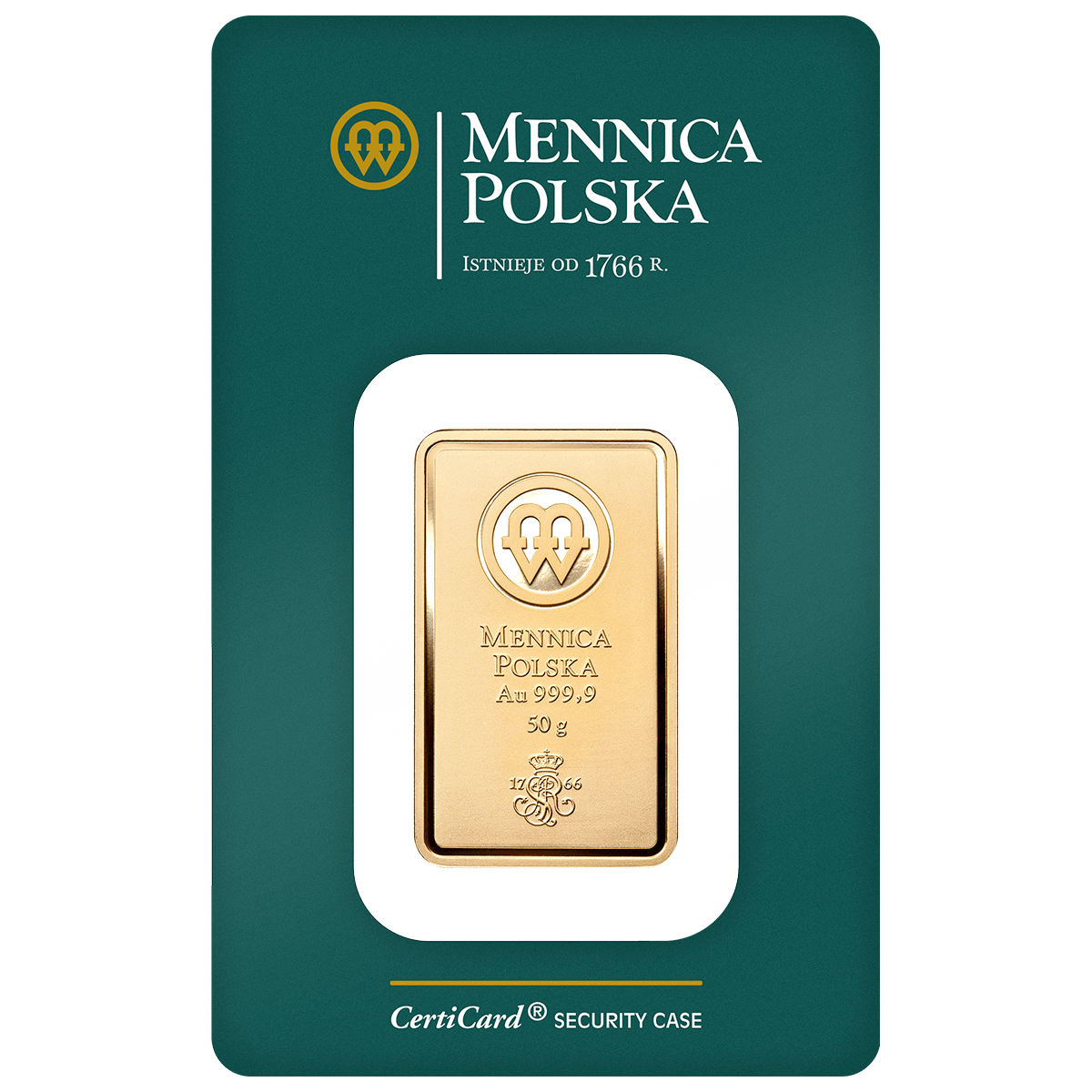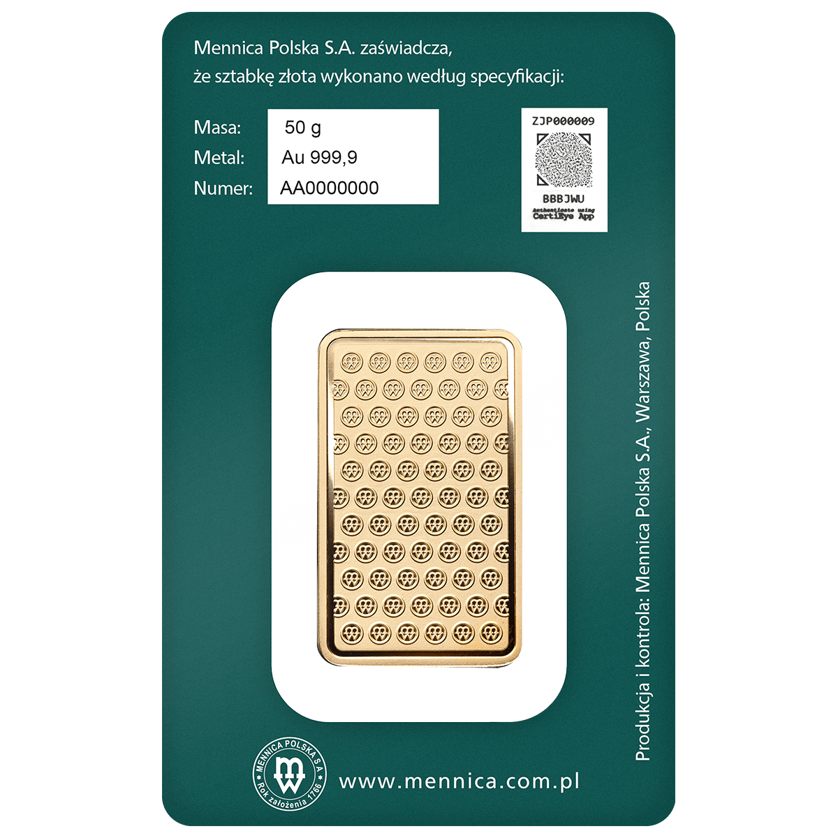 Sztabka o masie 50g sprzedawana jest w specjalnym opakowaniu gwarantującym jej autentyczność – CertiCard. Na opakowaniu podana jest specyfikacja sztabki – gramatura, zawartość złota oraz unikalny numer oferowanej sztabki. Na wizerunku sztabki znajduje się współczesny znak Mennicy Polskiej, a także masa sztabki oraz próba złota.